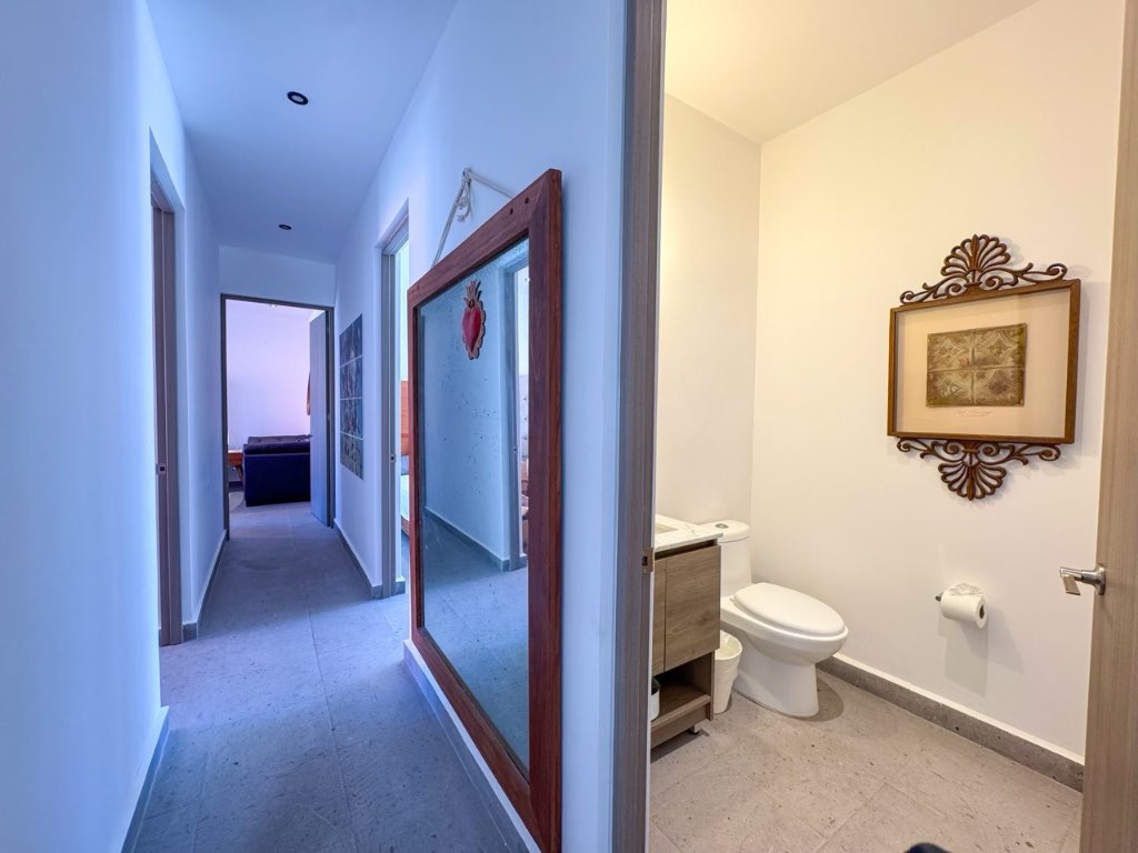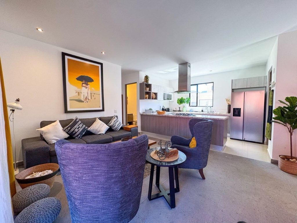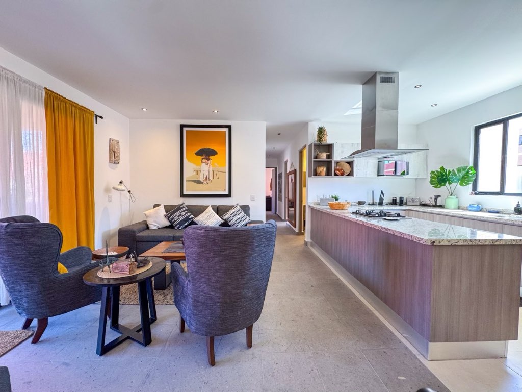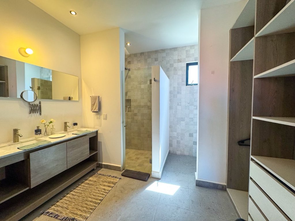 The property offers 3 bedrooms, each with its own en-suite bathroom, plus a guest half bath. Living and dining areas open to a private terrace, ideal for enjoying the views and outdoor living. The kitchen is spacious and practical, complemented by a separate laundry room.