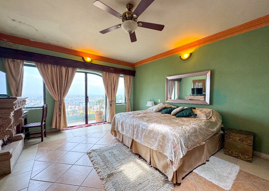 Bedroom 2 (3rd Floor): King-size bed, gas fireplace, ceiling fan, large desk, private balcony, and secure owner’s closet.