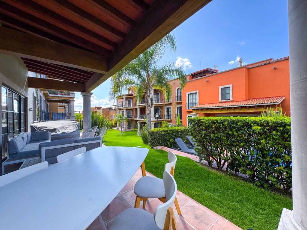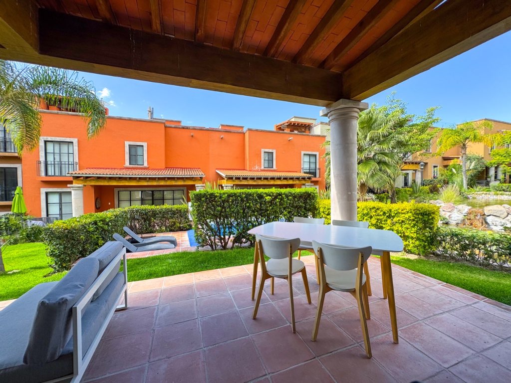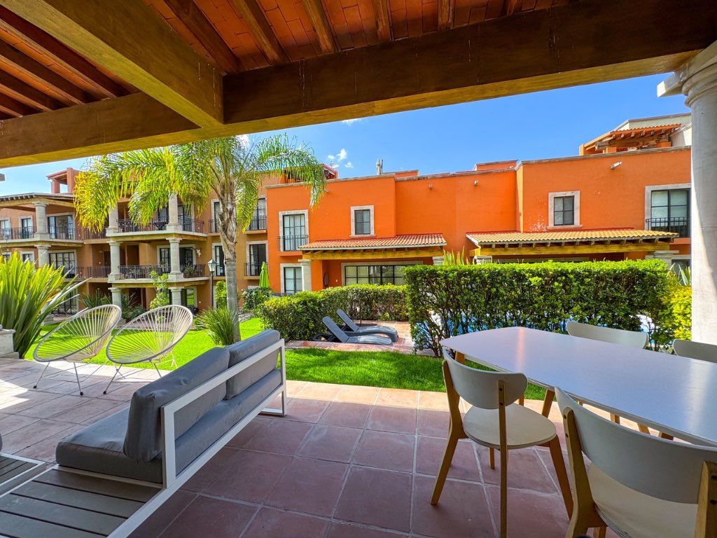 - Private terrace with outdoor seating and direct access to a pool and lush green areas